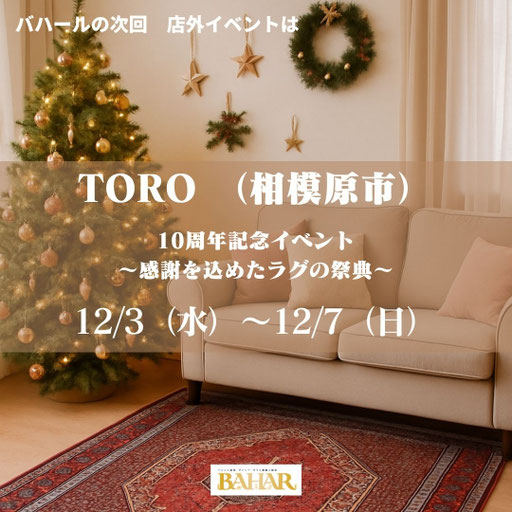 NEWS&TOPIC · 2025/11/23 店外イベント TORO(相模原市) バハールの店外イベントのお知らせ 12月3日(水)~12/7(土) 10周年を迎えるTOROさんの~感謝を込めたラグの祭典~ 寒い冬は勿論、1年中楽しめる素敵なトライバルラグやギャッベ、キリム、インテリア小物をお持ちしています。 セレクトしたちょっと甘めのトライバルラグは、優しいお部屋にしてくれます。 クリスマスプレゼントツアーのトライバルラグもお持ちしていますよ。 TORO さんは、 相模原市中央区千代田3丁目1-18 OPEN/10:30~17:00 tagPlaceholderカテゴリ: コメントをお書きください コメント: 0