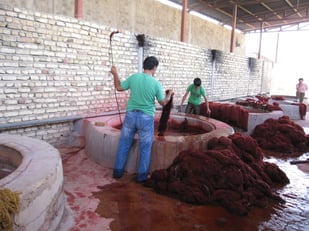 紡いだ糸は汚れを取り除き、熟練の染め手により高温の染料で染められます。