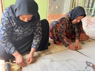 絨毯は、横に2〜3人が並んで織っていますが、1日に数センチ程しか織る事ができないため、1枚の絨毯が織り上がるには、とても長い時間がかかります。